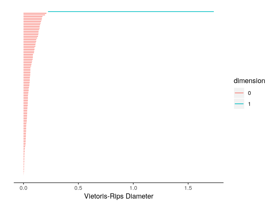 TDAstats uses the ggplot2 R package to create visualizations for persistent homology (Wickham 2009). One method of visualizing persistent homology is the topological barcode. Each feature is depicted by a single bar (ergo, a topological barcode) with its left edge at feature birth and its right edge at feature death. Thus, the persistence of a feature is depicted as the length of the bar. The horizontal axis of the barcode represents the Vietoris-Rips complex radius; the vertical axis is not inherently meaningful and is not strictly ordered. By convention, the order of features is in reverse of the order in the homology matrix. Hence, the dimension of features increases as you go higher up the vertical axis, as does the value of feature birth. For ease of interpretation, feature dimension is coded as the bar’s color, with an accompanying legend.