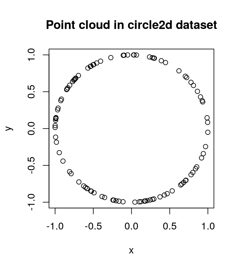 plot(circle2d, xlab = "x", ylab = "y", main = "Point cloud in circle2d dataset")