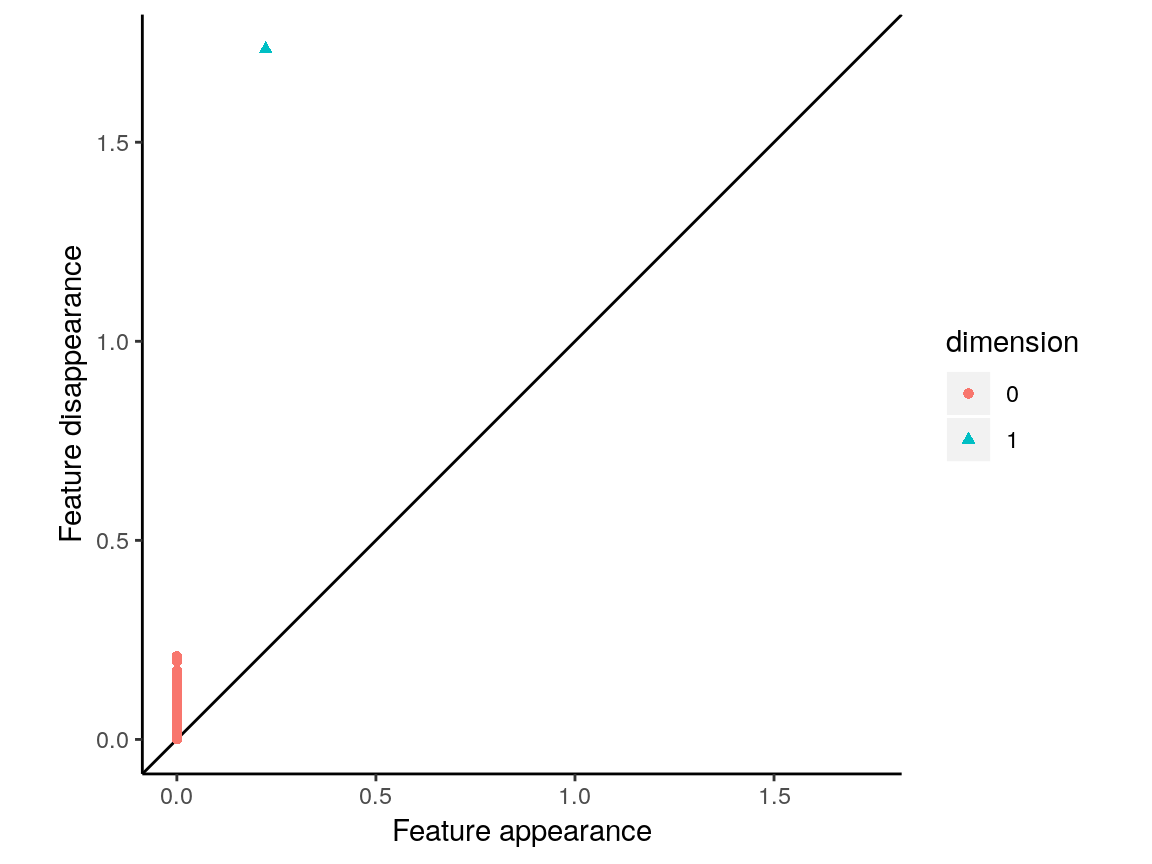 Another method of visualizing persistent homology is the persistence diagram. Each feature is depicted by a single point with the horizontal axis representing feature birth and the vertical axis representing feature death. The line \(y = x\) is included as a reference. Since feature birth always precedes feature death (\(x < y\)), all points in a persistence diagram lie above the reference line. In persistence diagrams, the persistence of a feature is depicted as the vertical distance between the point representing the feature and the reference line. Just like topological barcodes, feature dimension is coded as the point’s color, with an accompanying legend; however, feature dimension is redundantly coded as point shape in case of issues with color differentiation.