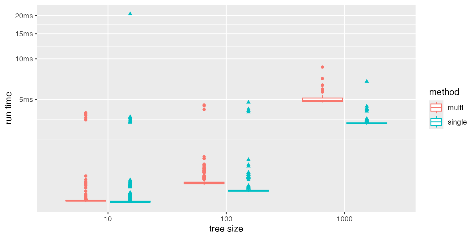 #> 2 single 255µs 276µs 3524. 1.24KB 14.7The R bindings are equivalent; while total runtimes will be higher than when comparing the Java programs directly, the differences between them should be the same. Indeed, the allocated memory is exactly the same. However, the single-pass algorithm—Propagate and Pair—is a marginal improvement over the multiple-pass merge pairing algorithm.