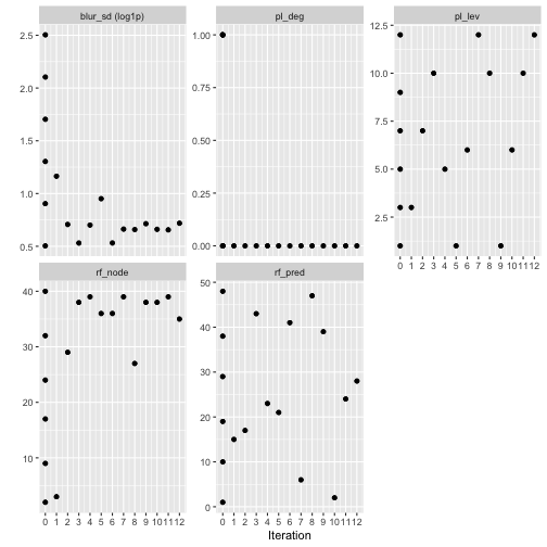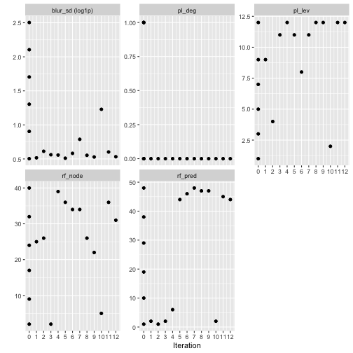 In this experiment, the pre-processing parameters quickly converged, whereas the model parameters were more difficult to optimize. Better results were obtained with less blur, lower-degree features, and more landscape levels. We also visualize the distribution of performance metrics at each iteration, to see what improvement each step incurred: